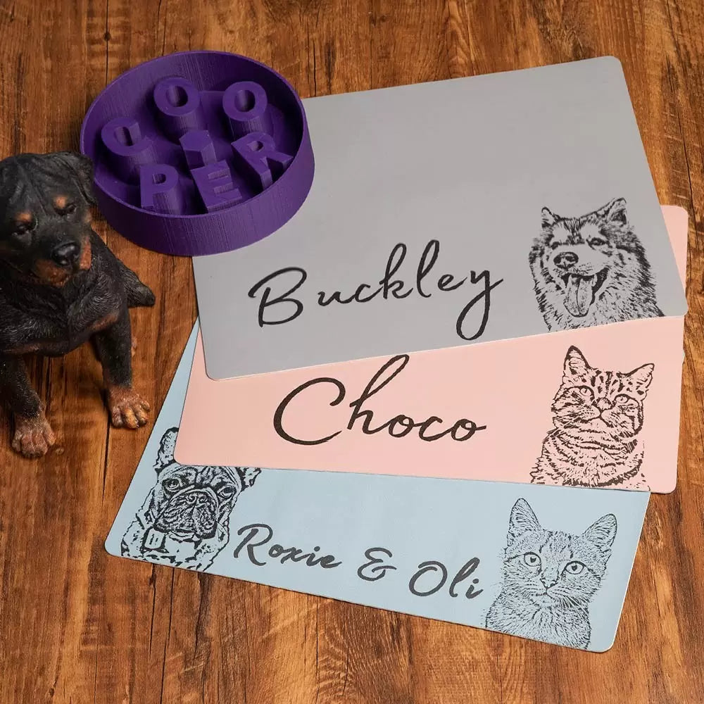 - Make mealtime extra special for your furry friend with our Custom Name Pet Mat with Photo! This adorable and practical mat features your pet’s photo and name, turning an everyday essential into a one-of-a-kind piece just for them.