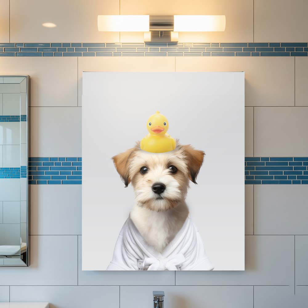 - Turn your pet into the star of a hilarious bathroom scene with our Funny Custom Pet Portrait Bathroom Art! Perfect for pet lovers with a sense of humor, this artwork transforms your furry friend into a spa-day superstar — complete with a cozy bathrobe, rubber ducky, cucumber eye mask, or even a toilet paper crown!