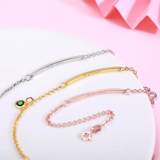 Custom Birthstone Bracelet For Mom | Dainty birthstone bracelet with engraved text bar