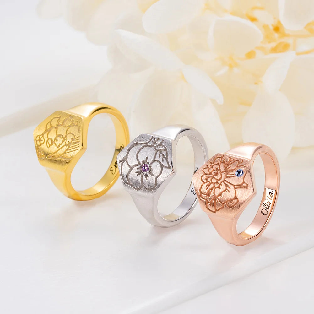 Signet Ring Style: Embrace a classic and sophisticated look with the timeless Signet Ring style. The birth flower engraving takes center stage, making it a distinctive and meaningful accessory.