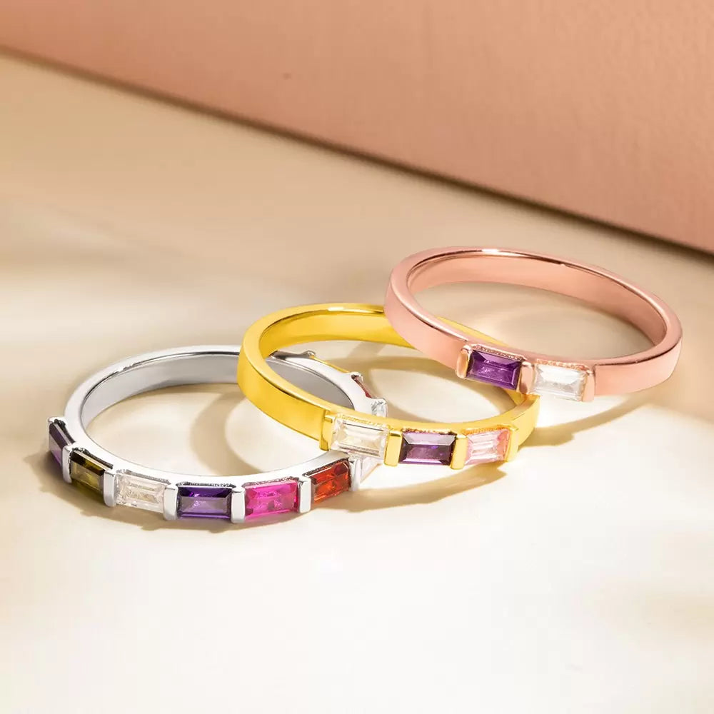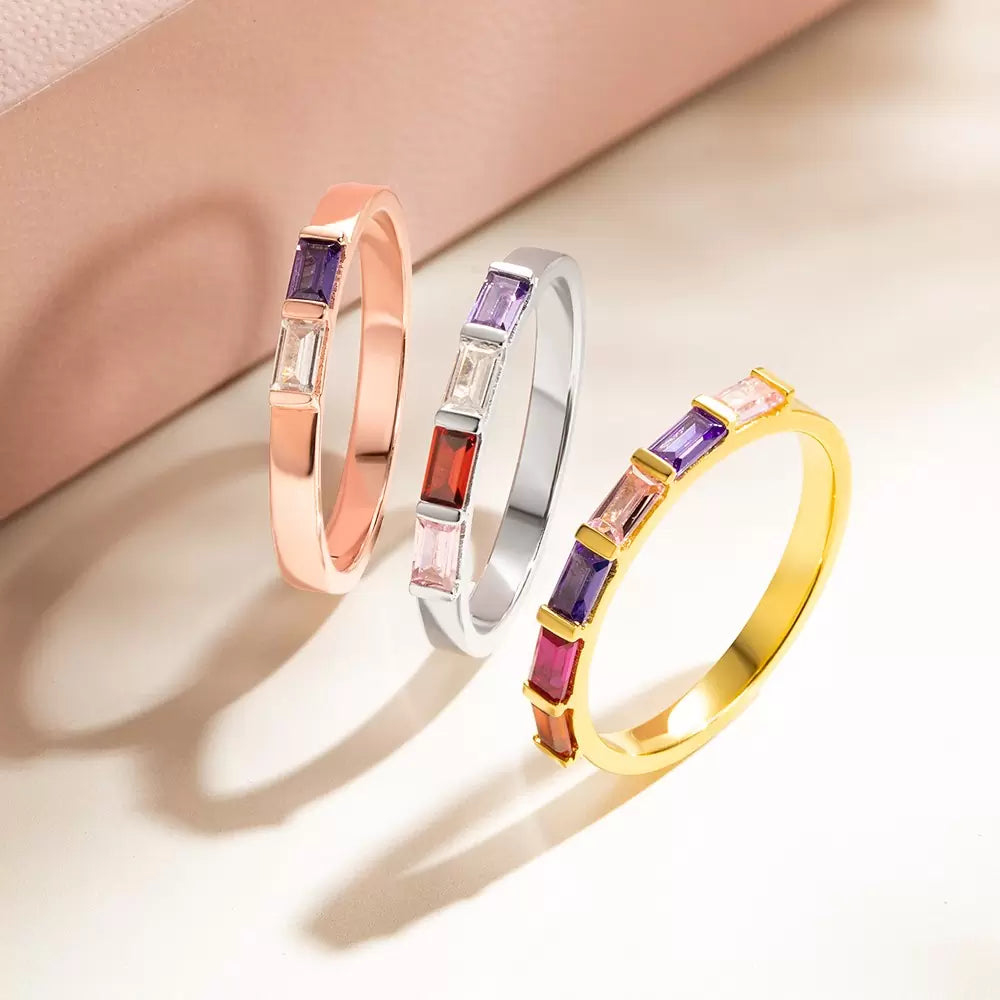 Add a vibrant touch to your jewelry collection with stackable birthstone bands! Customizable with up to six rectangular birthstones, these bands create an exquisite, colorful shine across each ring. Crafted from 925 sterling silver, they offer a timeless yet durable design, perfect for everyday wear or special occasions.
