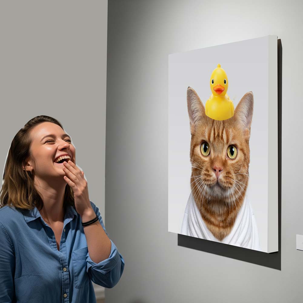 🐾Turn your furry friend into the star of the bathroom with our hilarious funny pet portraits! This lighthearted artwork features your pet dressed in a bathrobe, complete with a duck toy, toilet roll, and cucumber eye-mask for the ultimate spa-day vibe.
