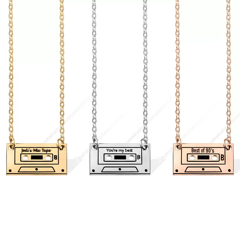 A fabulous, 80s inspired jewelry : this chic, itty-bitty mix-tape necklace! Tiny as it may be (1/2 inch!). Customizable with any title, name or date, it's the perfect 80s-style throwback that'll make 'em swoon. No need to hit rewind- they'll love it!