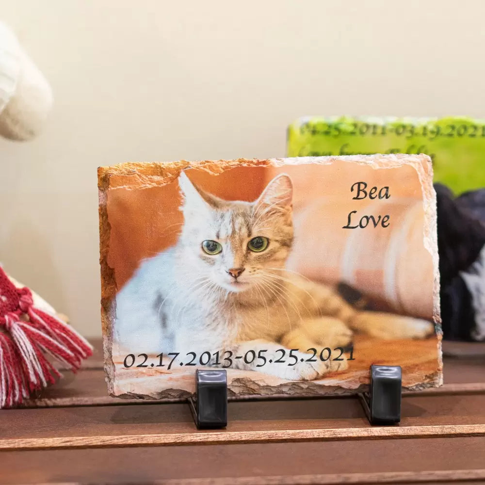 ♥ This unique slate slab makes a special keepsake to remember your pet - your favorite pet photo is heat-pressed into the glossy surface and won't chip, fade or peel. Keep the memory alive for years to come with this touching tribute.
