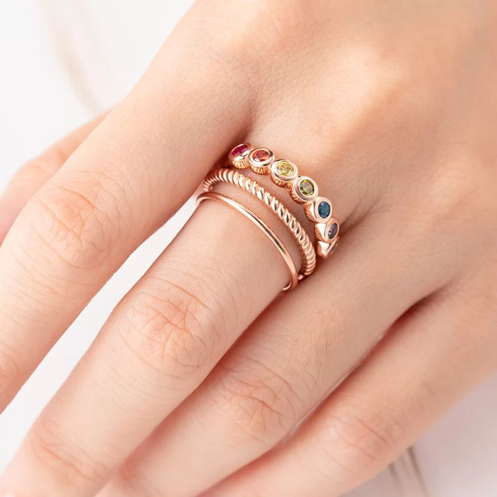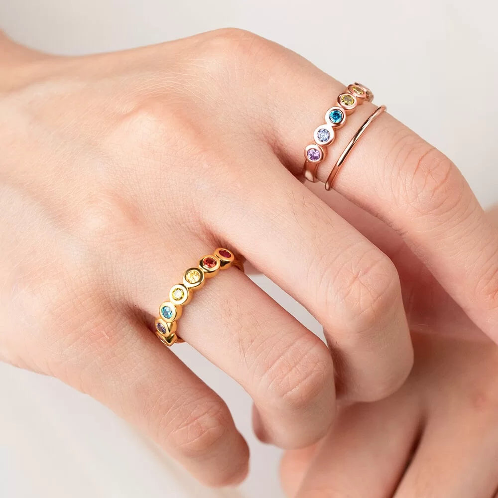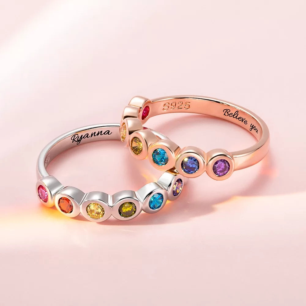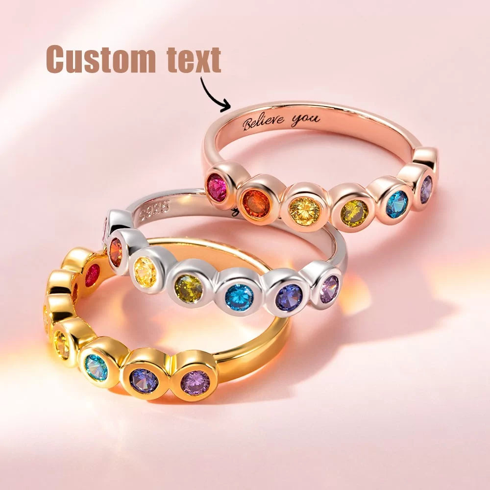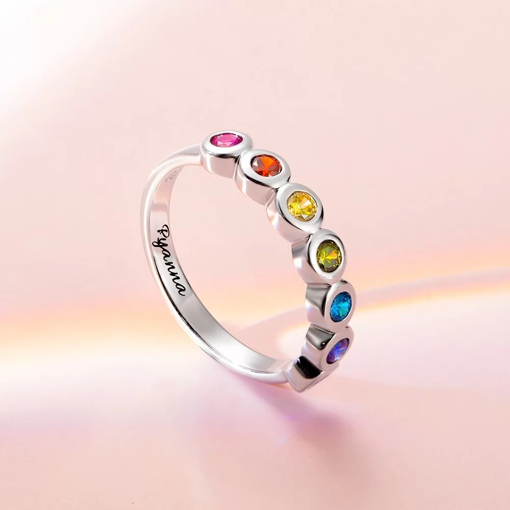 ♥ Our Personalized Multistone Rainbow Ring beautifully showcases the seven vibrant colors of the rainbow, each representing the energy of the chakra points. This unique piece can be engraved with custom text inside the band, adding a personal touch to this meaningful accessory. Crafted from 925 sterling silver, this ring offers both elegance and durability, making it a cherished keepsake.