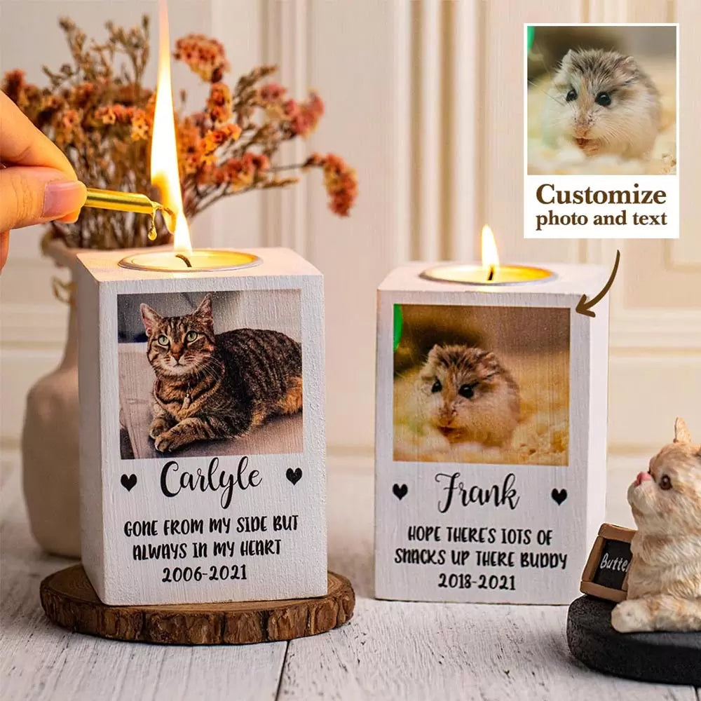 ♥ Light up your pet's memory with our pet memorial tea light holder. Personalize it with your pet's photo, name, and a message of your choice , add on a date if you wish.-- the perfect way to commemorate your beloved friend. Crafted from wood with intricate engravings, it's the perfect way to keep your pet's memory alive. So light it up and get ready to reminisce!