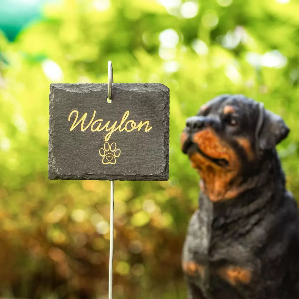 ♥ Commemorate a beloved pet with this intricately crafted Dog Remembrance Plaque , etched with the name, birth, and death of your furry friend. The aged-slate material creates an elegant, timeless representation of a treasured pet, perfectly suited for placement in gardens or other outdoor locations. Pay tribute to a faithful companion with poise and grace.